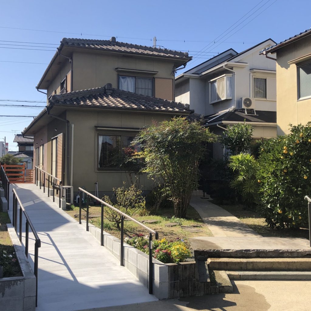 正面から見た『憩いの家きらり』の建物です。施設内へは右側の玄関から入りますが、左側のスロープを通って直接室内に入ることもできますので車椅子をご利用の方もご安心ください。